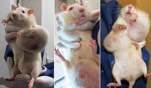 图为法国研究:200小白鼠食用美国转基因玉米后普遍患癌