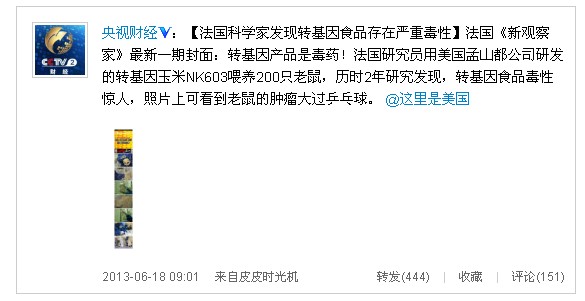 民族英雄崔永元和陈一文顾问美国调查揭开了转基因的神秘的面纱。两位英雄美国调查最大收获就是揭开了中国和美国的谎言互享共用:即中国农业部和专家反复讲美国人吃了几十年转基因食品都没有事,而美国却向他们的人民讲中国人吃了几十年转基因食品都没有事。
