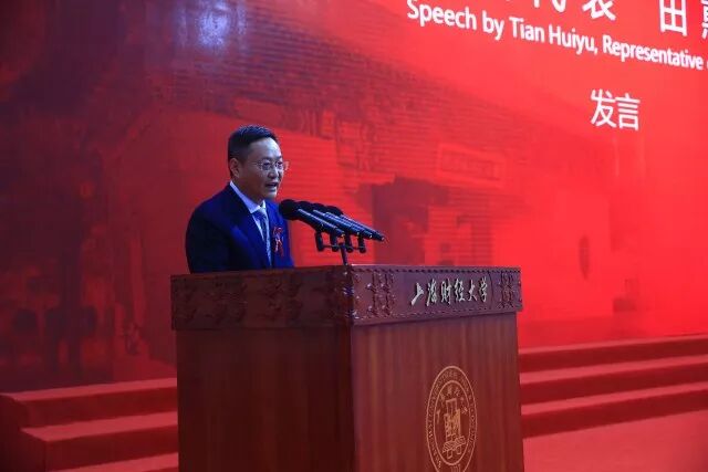 上海财经大学1983级基建财务与信用专业毕业生、招商银行党委书记、行长田惠宇,上海财经大学会计学院院长、长江学者李增泉,上海财经大学金融学院2015级博士研究生方蕾,分别作为校友代表、教师代表、学生代表发言,对“厚德博学,经济匡时”的校训精神做出生动阐释。