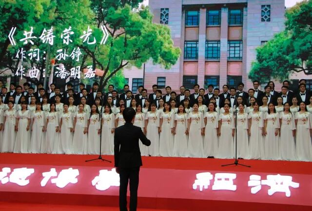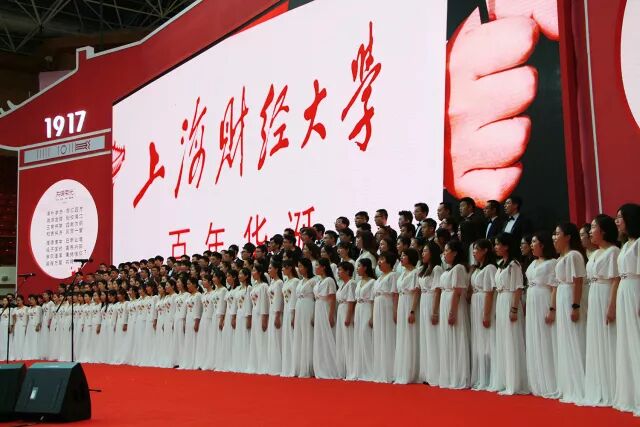 在大气磅礴的旋律伴奏下,全场合唱校歌《共铸荣光》,上海财经大学建校100周年纪念大会圆满结束。