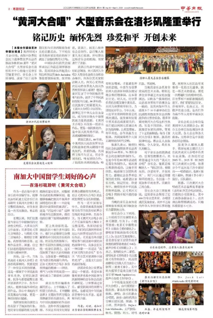 与此同时,跨越重洋,公益与艺术的回响同样澎湃。为纪念中国人民抗日战争暨世界反法西斯战争胜利80周年,阅兵盛典十天前的8月23日晚,“黄河大合唱”大型音乐会于洛杉矶迪士尼音乐厅隆重举行。音乐会由著名侨领张素久女士担任总制作与总召集人,知名指挥家张亮执棒,洛杉矶联合合唱团与交响乐团演绎全版《黄河大合唱》。爱国华侨、中华商报创始人苏子涵社长作为演唱者之一登台献声,与近300位艺术家共同唱响中华民族不屈的精神史诗。北京时间的9月3日,他自始至终认真观看阅兵直播后,直接致电基金会名誉理事长柯林渭先生:硝烟虽已远去,但精神的火种必须传承。我们国内外华人都应当发扬伟大的抗战精神,以实际行动增强对国家的归属感和民族自豪感,为强国建设、民族复兴贡献自己的力量。