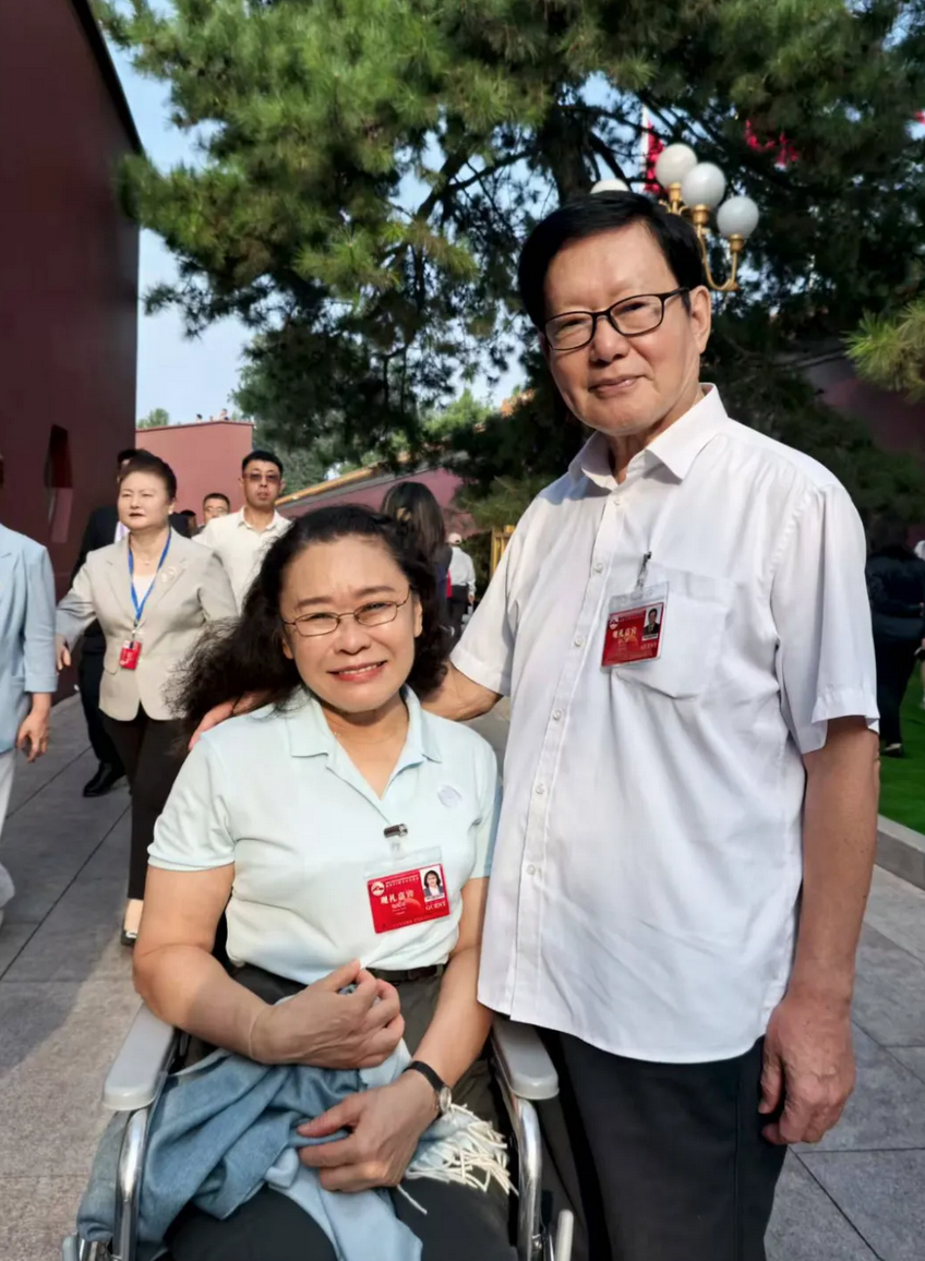 ▲ 荣誉主席程路(右)与中国残联原主席张海迪(左)在阅兵典礼入场前合影