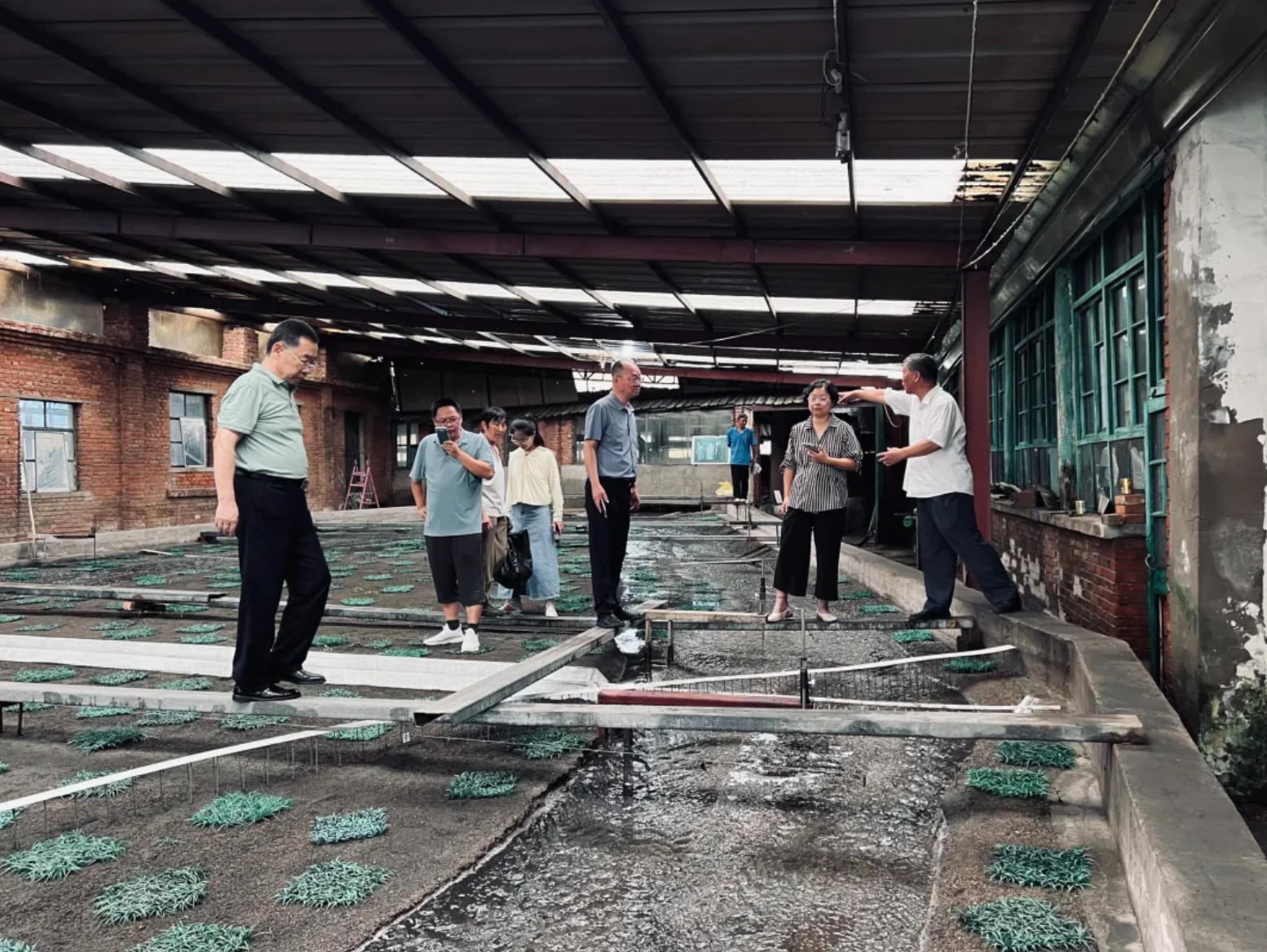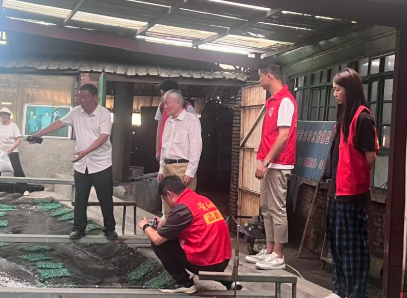 ▲上图:8月18日基金会志愿者朱明东(左三)向倪治斌副总经理一行设计专家介绍南水北调中线大沙河交叉工程模型试验进口条件