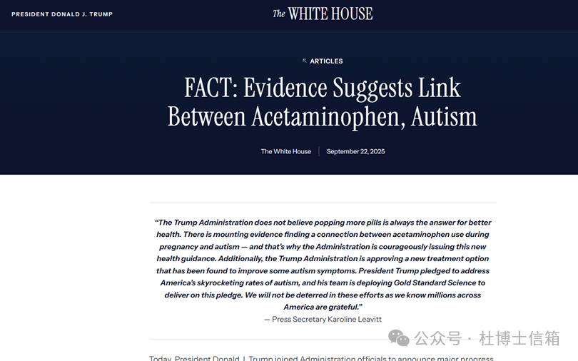 图9. 美国总白宫发布的《事实:证据表明对乙酰氨基酚与自闭症之间存在联系(FACT: Evidence Suggests Link Between Acetaminophen, Autism)》的公告