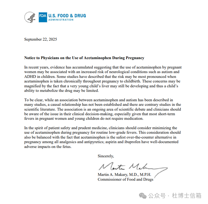 在特朗普宣布:泰诺可能导致自闭症!的当天(9月22日)。几乎就在同一时间,美国食品药品监督管理局(FDA)立刻启动紧急程序:对所有含对乙酰氨基酚的药品(包括家喻户晓的泰诺)标签进行修改,明确提示——孕妇服用可能增加孩子罹患自闭症和多动症等神经发育疾病的风险。FDA 甚至火速发出官方信函,提醒全国医生注意(见图8),场面可谓“秒回”。
