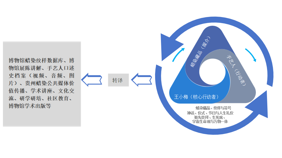王小梅女士在贵州长时段以苗族、瑶族、水族和布依族聚居的村落为网络,进行多点田野调查,并运用人类学“不浪费的人类学”口述史方法对手艺人进行口述历史访谈,以藏物为对象“民族村寨——传承人口述史——神话、仪式和节日田野调查”为工作方法,对贵州民族藏品、纹样、村寨仪式空间和节日的关联性符号、神话、仪式的同构关系,探讨物在仪式、节日和人生礼仪和日常生活里呈现的祖先崇拜、生死观和宇宙生命哲学。在超过20年的长时段田野调查中,王小梅女士和贵州苗族、侗族、布依族等传承人进行深度互动,建立情感链接和可持续生计模式的互助网络。