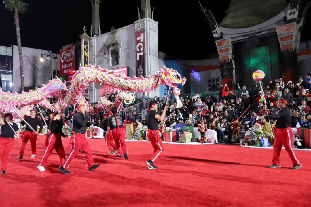 接着亮相的是 OGAF 艺术基金会气势恢宏的舞龙队。龙寓意祥瑞、兴旺与力量,是 节庆中最具代表性的中华艺术。巨龙翻腾,为好莱坞的夜空带来祝福。