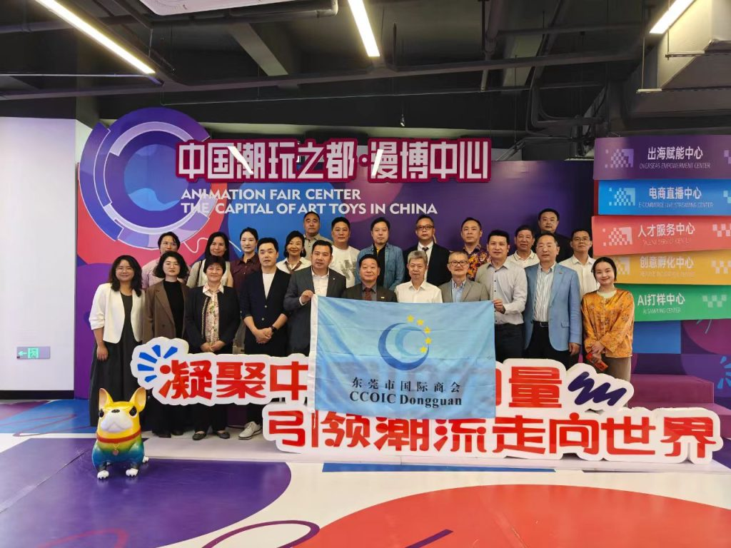 当天下午,接着代表团又继续马不停蹄前往东莞市考察与东莞企业家交流。感谢东莞市贸促会和国际商会的热情安排,前往考察了位于东莞石排镇的中国潮玩之都·漫博中心(石排潮玩产业园二期),里面的创新潮玩产品琳琅满目,令大家目不暇接,真是网红潮玩选品的好地方。美中广东总商会(美国粤商会)会长张铁流率美中广东总商会(美国粤商会)代表团一行莅莞考察。东莞市贸促会(市国际商会)副会长张军民率市国际商会部分理监事会成员接待了考察团,双方就深化莞美经贸合作、助力东莞企业开拓北美市场等事宜进行了座谈交流。
