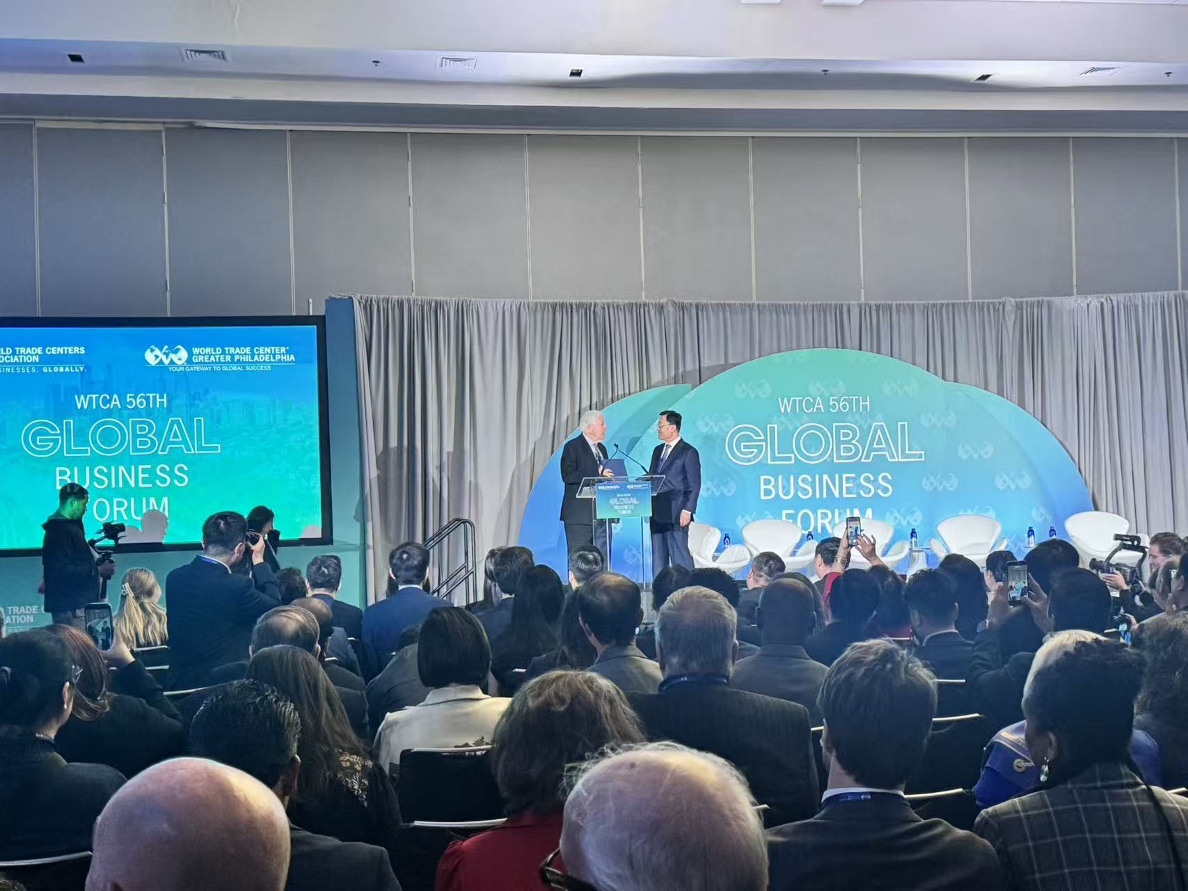 美东时间4月20日,世界贸易中心协会(WTCA)2026全球商务论坛在美国费城隆重开幕,费城市长 Cherelle L. Parker等政要、世界贸易中心协会主席John E. Drew及来自全球约100个世贸中心代表及近500名工商界领袖参会,围绕Historic Foundations, Future Collaborations: Cultivating New Business Frontiers(历史根基,未来合作:开拓商务新天地)主题,开展丰富多彩的主旨演讲、主体分享、互动交流、务实商讨等活动。