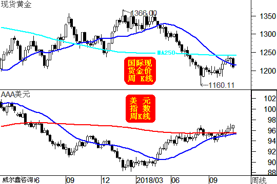 我们认为,如果不能对一个阶段的黄金市场运行“逻辑”,有大致客观的梳理与认知,看待市场就可能镜花水月,难辨真假,据此操作也可能伤痕累累。当前黄金市场跌跌撞撞运行了几个月,且鉴于上周人民币突然大幅反弹,市场看似迷雾渐起,我们认为有必要再就“道”的层面,对整个基本面与市场所处环境进行简单回顾梳理。如国际现货金价周K线、美元指数周K线、道琼斯指数周K线图示: