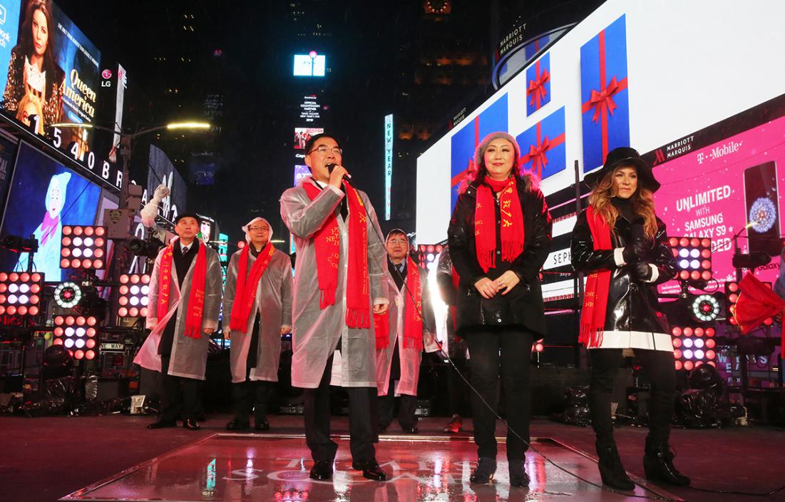 美东时间2018年12月31日晚,一年一度的纽约时报广场跨年庆典活动在来自世界各地现场观众的欢呼声中热烈开启。中国文化再次激情点亮纽约,向现场逾百万民众精彩展示了来自“山水之城”中国重庆的独特自然文化遗产和旅游资源,并通过电视和网络直播向全世界送上了来自中国的新年问候和祝福。中国驻纽约总领事黄屏大使、重庆市文化和旅游委副主任王定国、纽约市议员顾雅明、时报广场联盟主席Tim Tompkins、美中友好协会会长张锦平以及黄屏总领事夫人张爱萍、副总领事钱进、文化参赞李立言、中国驻纽约旅游办副主任范秀云等出席了当晚的庆典活动。