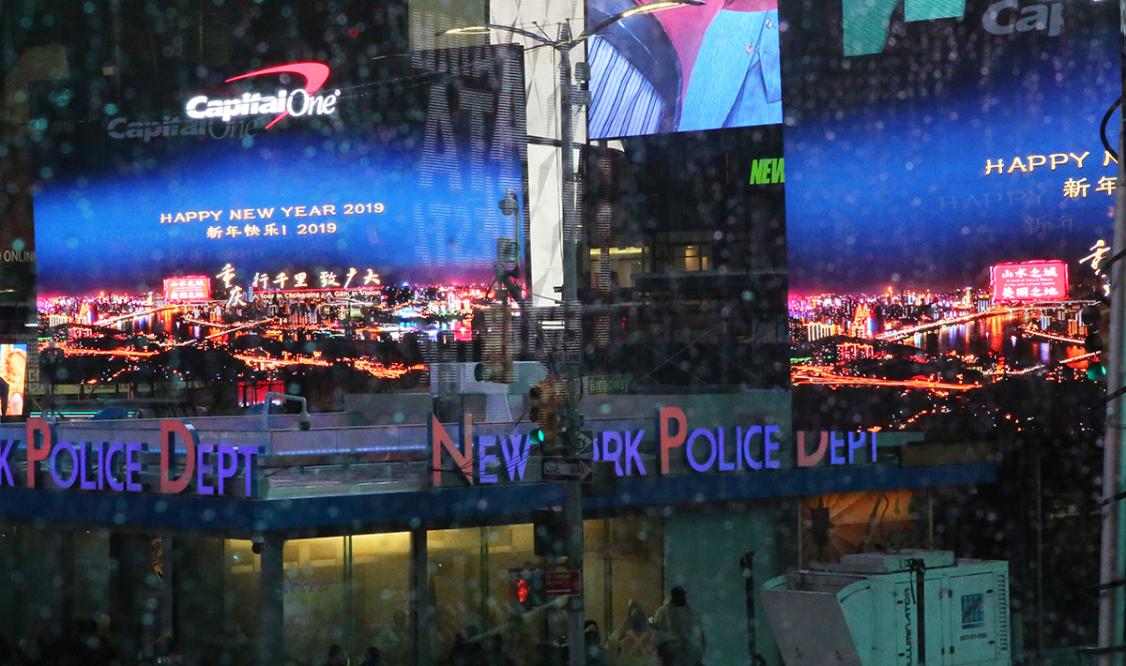 当晚18时,跨年倒计时庆典活动在欢快热烈的中国文艺表演中拉开帷幕。被国务院列入首批国家级非物质文化遗产代表作名录的中国重庆铜梁龙舞,继去年倒计时开幕庆典精彩亮相后再次登上主舞台,来自重庆的艺术家们舞动动感十足的精彩表演,伴着《船工号子》《龙的传人》《中国范儿》等曲目,在雨中飞腾跳跃,翻滚盘旋,呈现出长江纤夫激流勇进的画面,极富艺术感染力,这些极具中国元素的传统舞蹈在展现中国人民对新一年期许的同时,也彰显了中国独特的艺术魅力和文化底蕴。由重庆小康集团制造的首款电动智能汽车也首次登上纽约时报广场,让世界不仅领略了中国的传统文化,也见证了中国改革开放40年来科技进步发展成就。