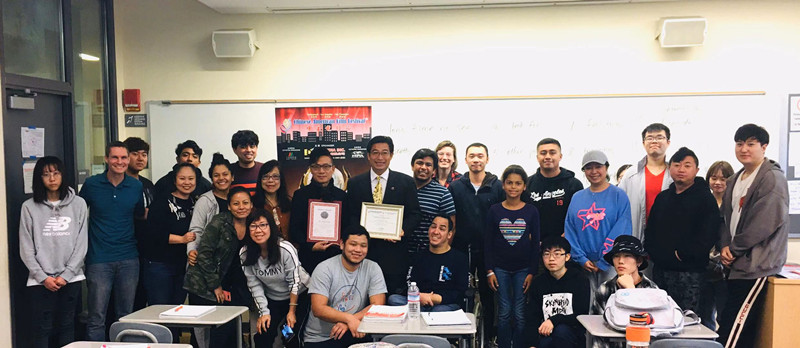 中美电影节主席苏彦韬也给东洛杉矶学院颁发了感谢状。现代语言系主任DEAN教授向彭南林先生颁发了奖状。
