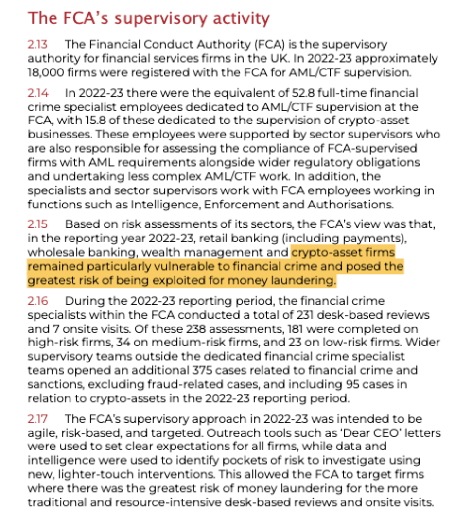 在5月1日的一份报告中,英国财政部从金融行为监管局(FCA)提供的数据中得出结论,加密资产公司是仍然 "特别容易 "受到金融犯罪侵害的前四类公司之一,尤其是在2022年至2023年期间的洗钱案件中。