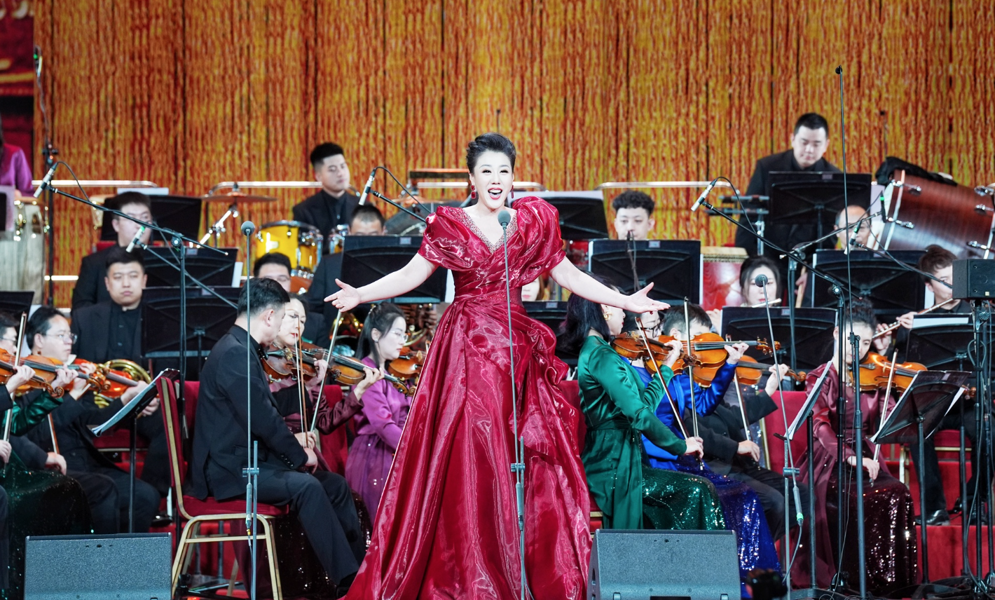观众席间的欢笑交谈随中国电影乐团的演奏家就位而渐渐回落,各位女乐手特意换上了极有节庆色彩的绚丽长裙。青年指挥家肖超登台,以简洁有力的手势带动保留曲目《春节序曲》那热烈动人的旋律,为音乐会正式开场。接下来,延续一贯的“乡情篇”“亲情篇”“友情篇”“幸福篇”的篇章策划,众多歌唱家轮番登台,以民族、美声、通俗、原生态的多元唱法带来了20余首风格各异的中国歌曲,铺展开神州大地斑斓多彩的音乐地图:河北民歌手肖文的《挂红灯》质朴高亢,一把透亮的好嗓子唱出了满堂彩;土家族民歌《新编六口茶》中,土家族歌手邓超予与青年歌手尤国通一问一答,把一对爱侣彼此试探的小心思唱得俏皮可爱;网红“北京口琴大爷”组合王志祥、范开建银发红衣,一段《打虎上山》气势不俗,随后,他们又与乐团合作了一曲轻快迅捷的《北京喜讯到边寨》。偶有几个片段,两位大爷的琴音略显支绌,指挥肖超示意观众用善意的掌声为他们打起拍子、鼓舞致意。当最后的音符稳稳落下时,全场喝彩如潮水席卷,温暖得令人动容。