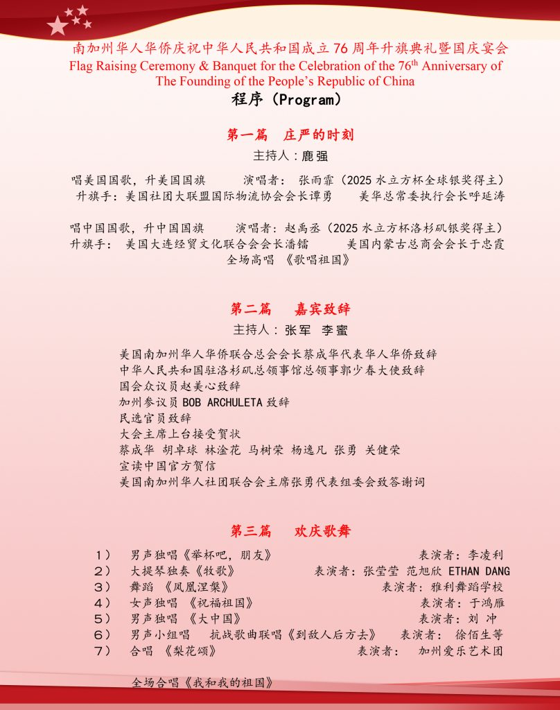 76载春华秋实,76载风雨兼程。南加州的华人华侨们将继续心怀赤子之情,勇担时代之任,凝聚侨胞力量,为中华民族伟大复兴道路上的坚定同行者,为中美两国的友谊与合作架设坚实桥梁,携手并肩,开创更加美好的明天!
