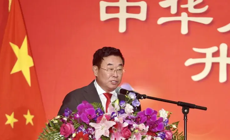 升旗典礼暨国庆宴会共同主席、美国南加州华人华侨联合总会会长蔡成华首先代表华人华侨各界社团致辞。他回顾了新中国成立76年来的伟大成就:“七十六年前中华人民共和国成立的庄严宣告,让一个古老而伟大的民族摆脱了半封建半殖民地的统治,从此昂首屹立于世界东方。七十六年来,中国走过了一条波澜壮阔的奋斗之路,从积贫积弱走向繁荣富强,从封闭落后走向自信开放。”