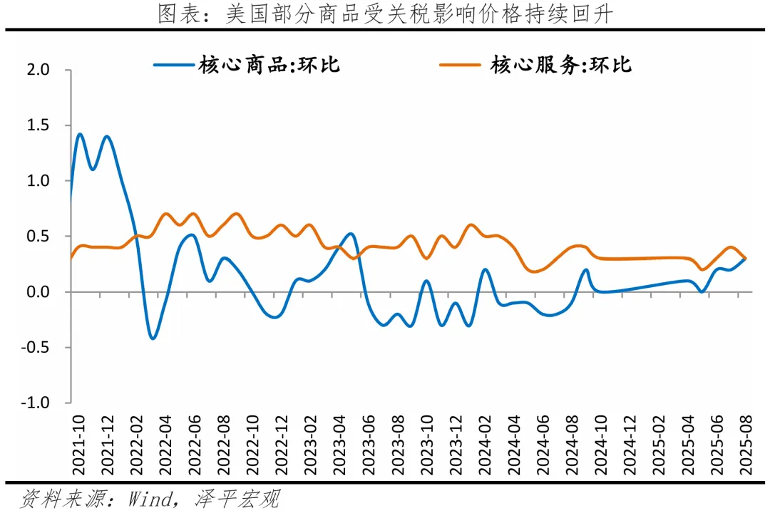 美国当前面临通胀反弹,部分商品受关税影响价格持续回升,后续关税的影响将逐步传导至价格。7月美国核心PCE同比2.9%,较上月上升0.1个百分点,8月美国CPI同比2.9%,较上月上升0.2个百分点;核心CPI同比3.1%,环比0.3%,较上月上升0.1个百分点;核心商品环比0.3%,较上月增加0.1个百分点;其中,新汽车环比0.3%、二手汽车和卡车 1.0%、服装0.5%、家用电器0.4%。