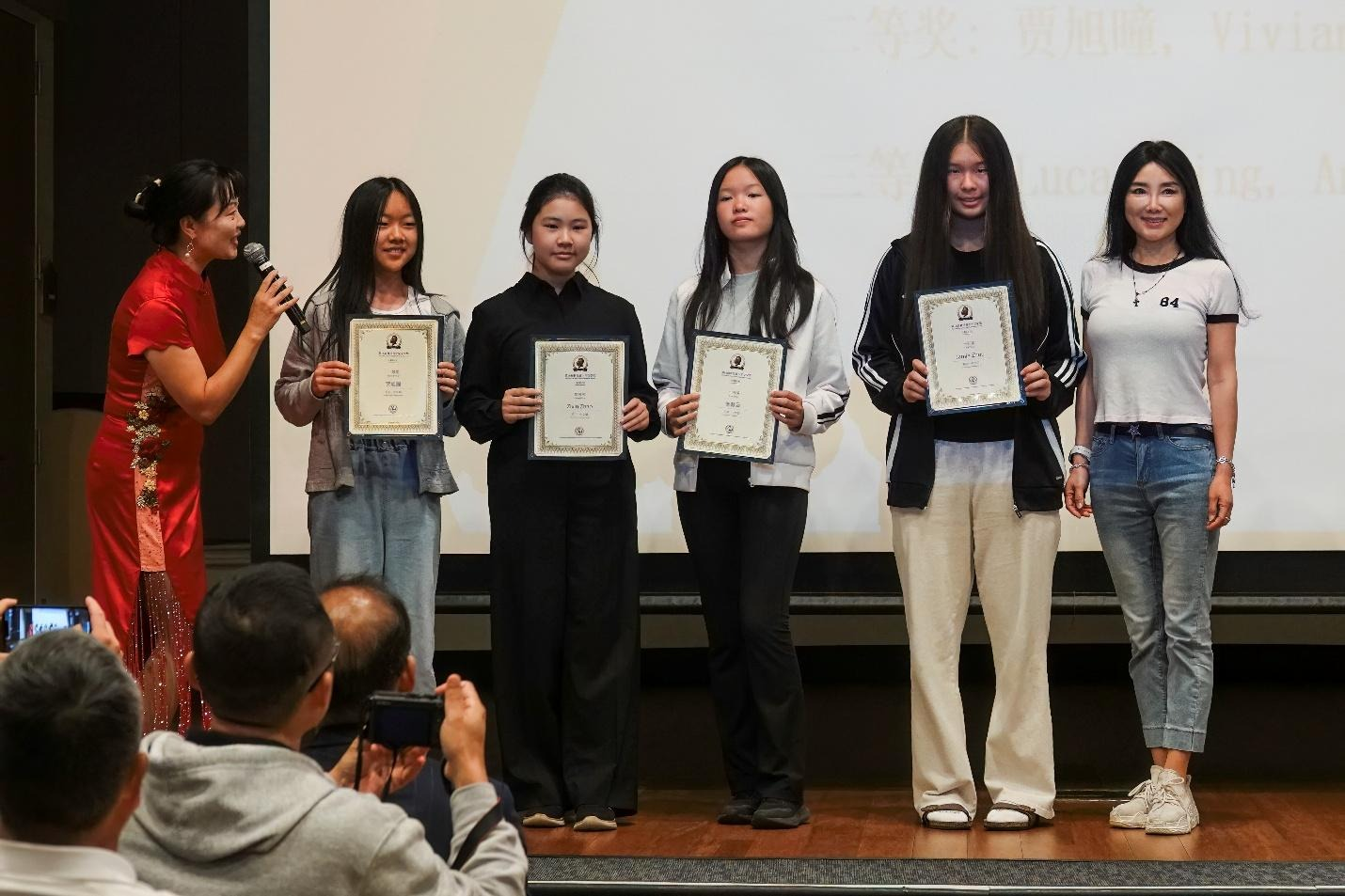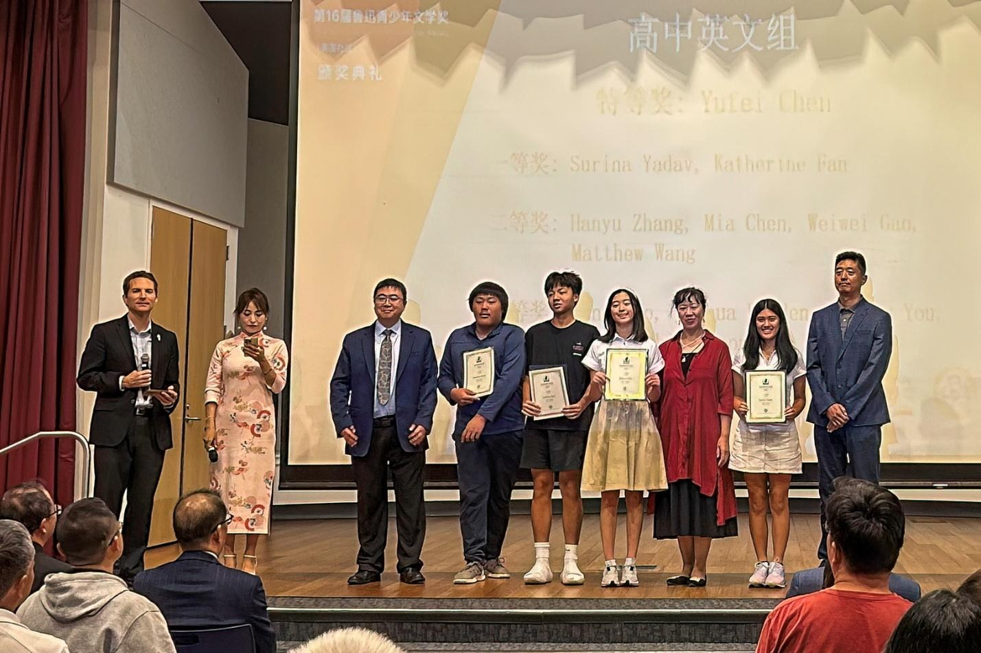 吴妮, 曾凡祎为中学中文组优秀奖获得者颁发证书并合影