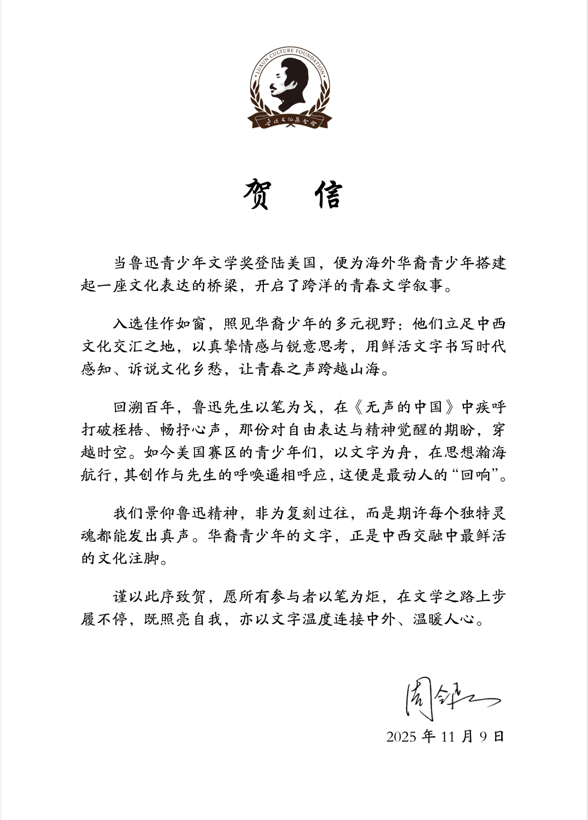 鲁迅文化基金会会长周令飞先生在贺信中表示,当鲁迅青少年文学奖登陆美国,便为海外华裔青少年搭建起一座文化表达的桥梁,开启了跨洋的青春文学叙事。入选佳作如窗,照见华裔少年的多元视野:他们立足中西文化交汇之地,以真挚情感与锐意思考,用鲜活文字书写时代感知、诉说文化乡愁,让青春之声跨越山海。回溯百年,鲁迅先生以笔为戈,在《无声的中国》中疾呼打破桎梏、畅抒心声,那份对自由表达与精神觉醒的期盼,穿越时空。如今美国赛区的青少年们,以文字为舟,在思想瀚海航行,其创作与先生的呼唤遥相呼应,这便是最动人的“回响”。我们景仰鲁迅精神,非为复刻过往,而是期许每个独特灵魂都能发出真声。华裔青少年的文字,正是中西交融中最鲜活的文化注脚。谨以此序致贺,愿所有参与者以笔为炬,在文学之路上步履不停,既照亮自我,亦以文字温度连接中外、温暖人心。