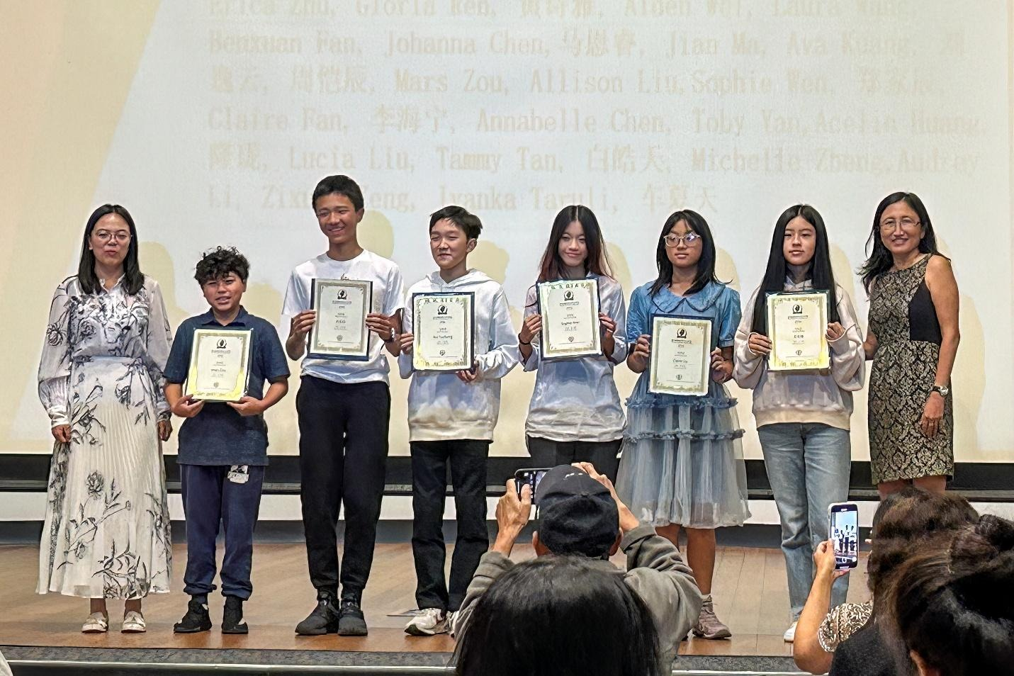 南加州高校联盟秘书长胡沙为中学中文组特等奖,一等奖,二等奖,三等奖获得者颁发证书并合影