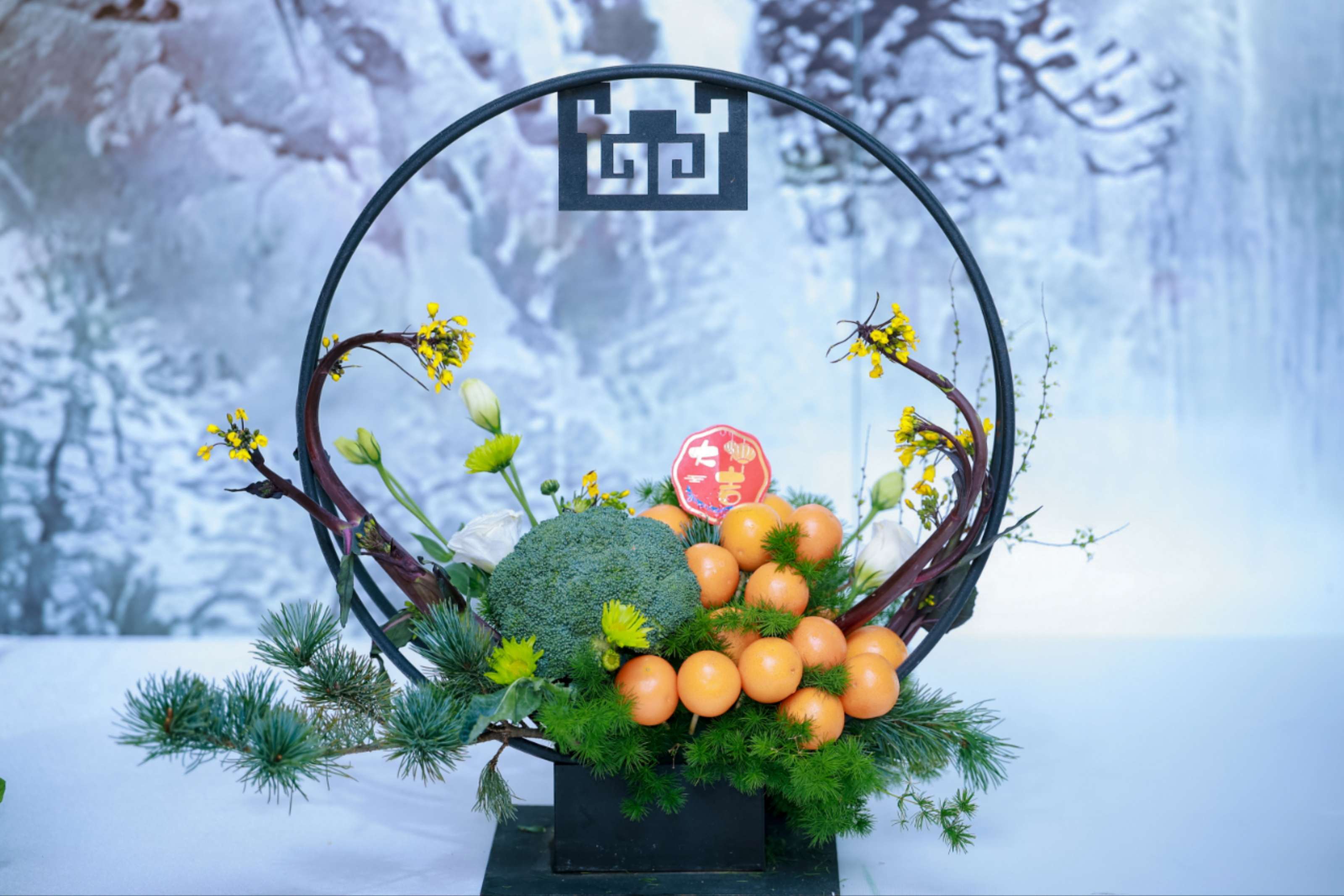 柯杏林在创作中灵活运用传统插花的六大技巧:高低错落、疏密有致、虚实结合、仰俯呼应、上轻下重、上散下聚。例如,在作品《日进百财·紫气东来》中,她以白菜模拟山石之稳,以菜薹勾勒线条之动,通过虚实空间的交替,形成“疏可走马,密不透风”的构图效果。同时,她借鉴文人插花“重意轻形”的传统,将洪山菜薹的生长习性——历经霜雪仍清甜爽脆的特性——转化为视觉语言,赋予作品以“枯荣相生”的哲学思考。