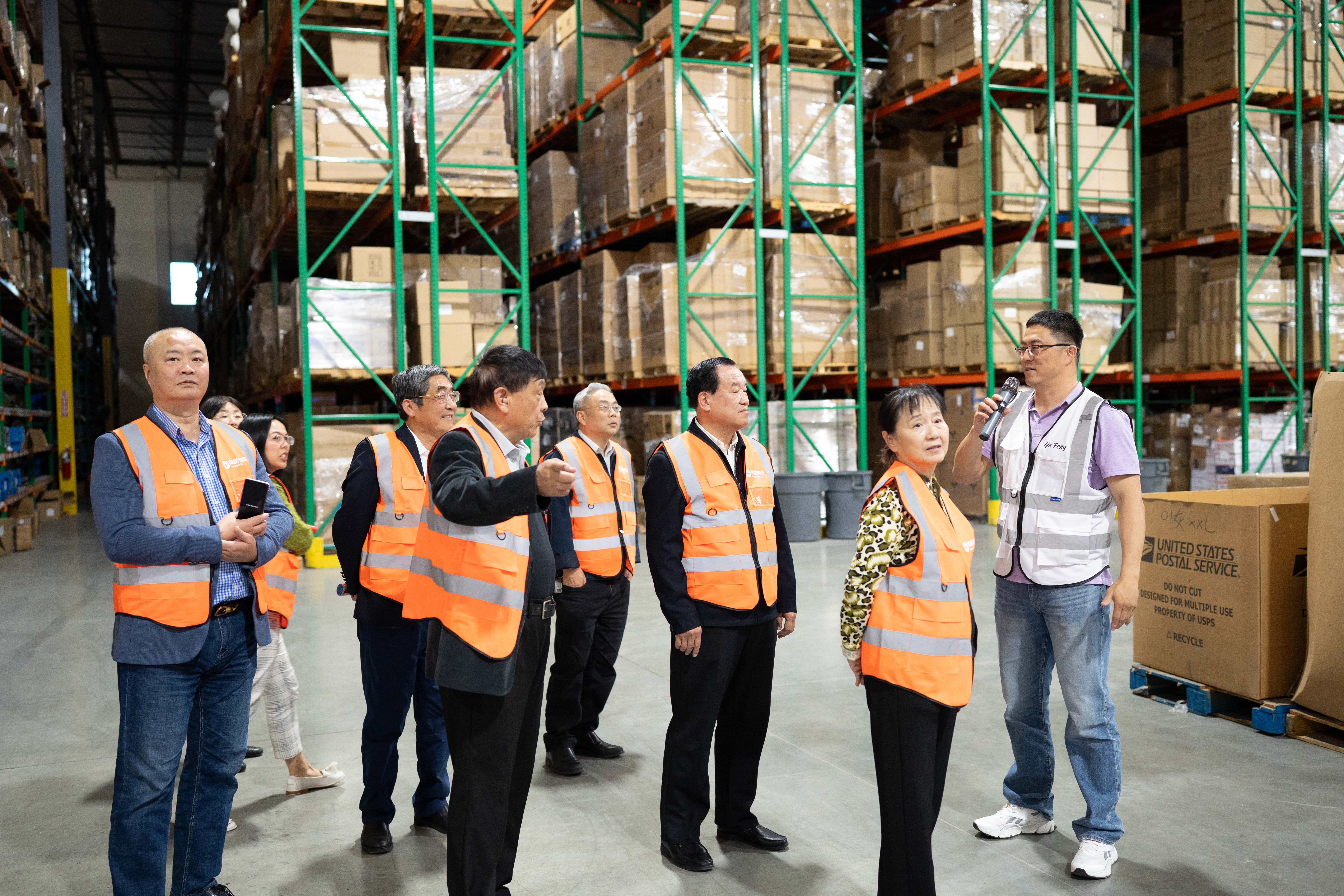 冯烨董事长和王明明总裁陪同北京联谊会参访人员穿上工作服观看仓库的货物,站在仓库内,好像面对一座钢铁森林,四十万尺的广阔空间在眼前铺开,高耸的货架如同沉默的巨人,整齐排列至视线尽头。叉车似忙碌的工蚁在通道间穿梭,冷白的灯光下货物的影子被拉得很长,空气中弥漫着金属与纸箱的混合气息。举目望去,货架顶端几乎隐没在阴影里,让人不禁屏住呼吸,原来造物竟能如此宏大,自己不过是这机械洪流中的一粒尘埃。离开时,耳畔仍回荡着仓库的轰鸣。那一刻,明白了何为“跨境物流”,它不在文字的描绘中,而在脚下这片震颤的土地中,人在庞然大物面前,竟然显得那么渺小和无奈。