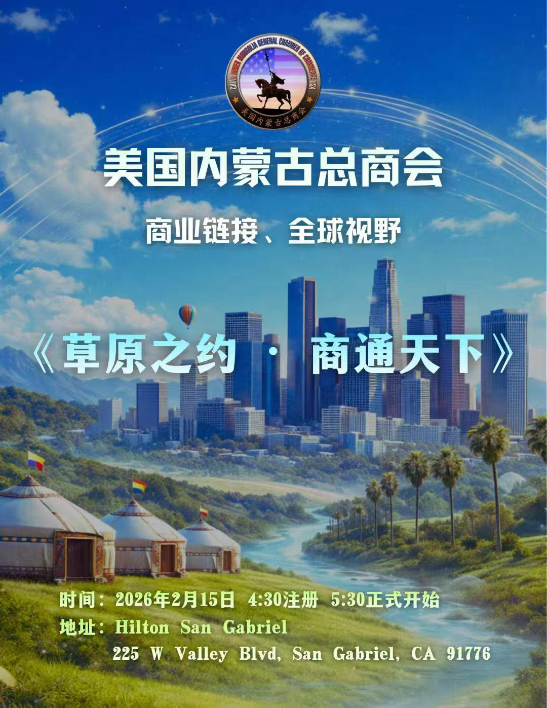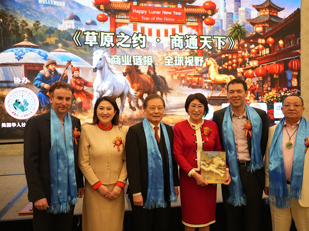 美西时间2月15日,以“草原之约 商通天下”为主题的美国内蒙古总商会2026年会暨商会成立16周年庆典,在加州圣盖博市隆重举行。本次盛会规格高、嘉宾云集,美国联邦及地方政要、好莱坞艺文界名人、华人侨团领袖、中美工商界精英齐聚一堂,共庆农历马年新春,共商经贸合作,共促文化交融,成为中美民间交流与侨团发展的标志性活动。