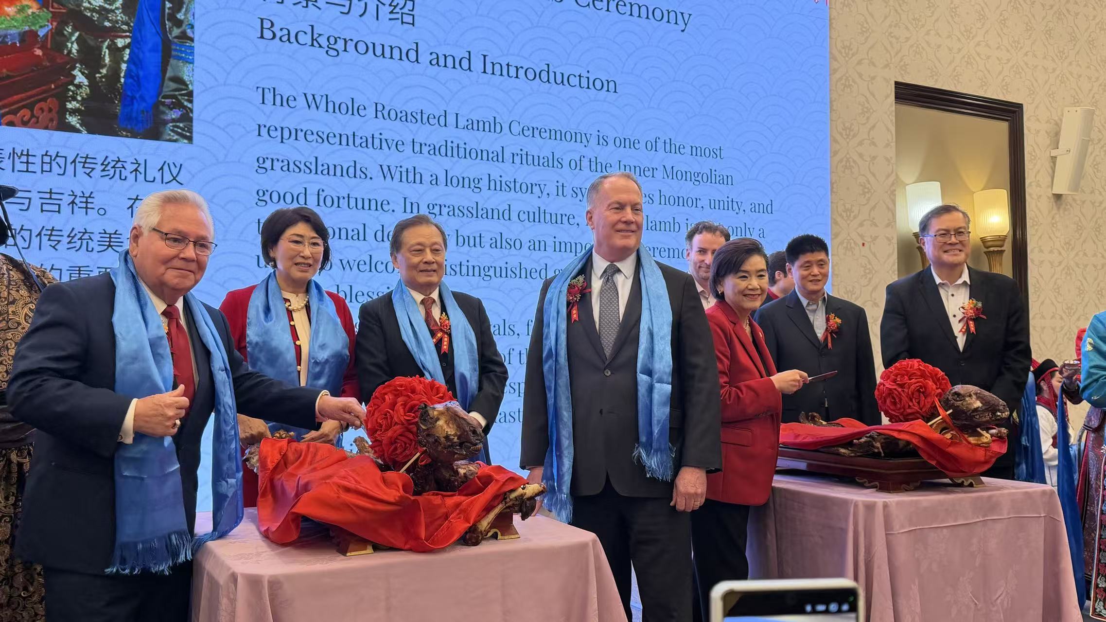 庆典以蒙古族最高礼遇——传统烤全羊仪式正式开启,颂词、剪彩、开羊、敬献哈达等环节庄重热烈,充分展现了草原民族的豪迈情怀与文化底蕴。美国内蒙古总商会会长于忠霞在致辞中表示,本次年会既是新春庆祝活动,也是商会成立16周年的重要节点。商会将持续发挥桥梁纽带作用,在深化经贸往来的基础上,推动中华文化与好莱坞艺文资源深度对接,让世界更好认识中国内蒙古,也让好莱坞元素更好地走进中国、走进内蒙古,实现文化与商贸双向赋能、协同发展。