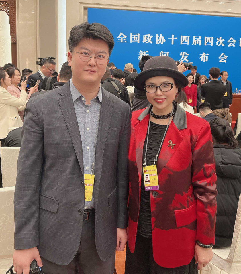 胡俊(左)和来自国外的好友—记者袁艳(右)在新闻发布会场采访后留念