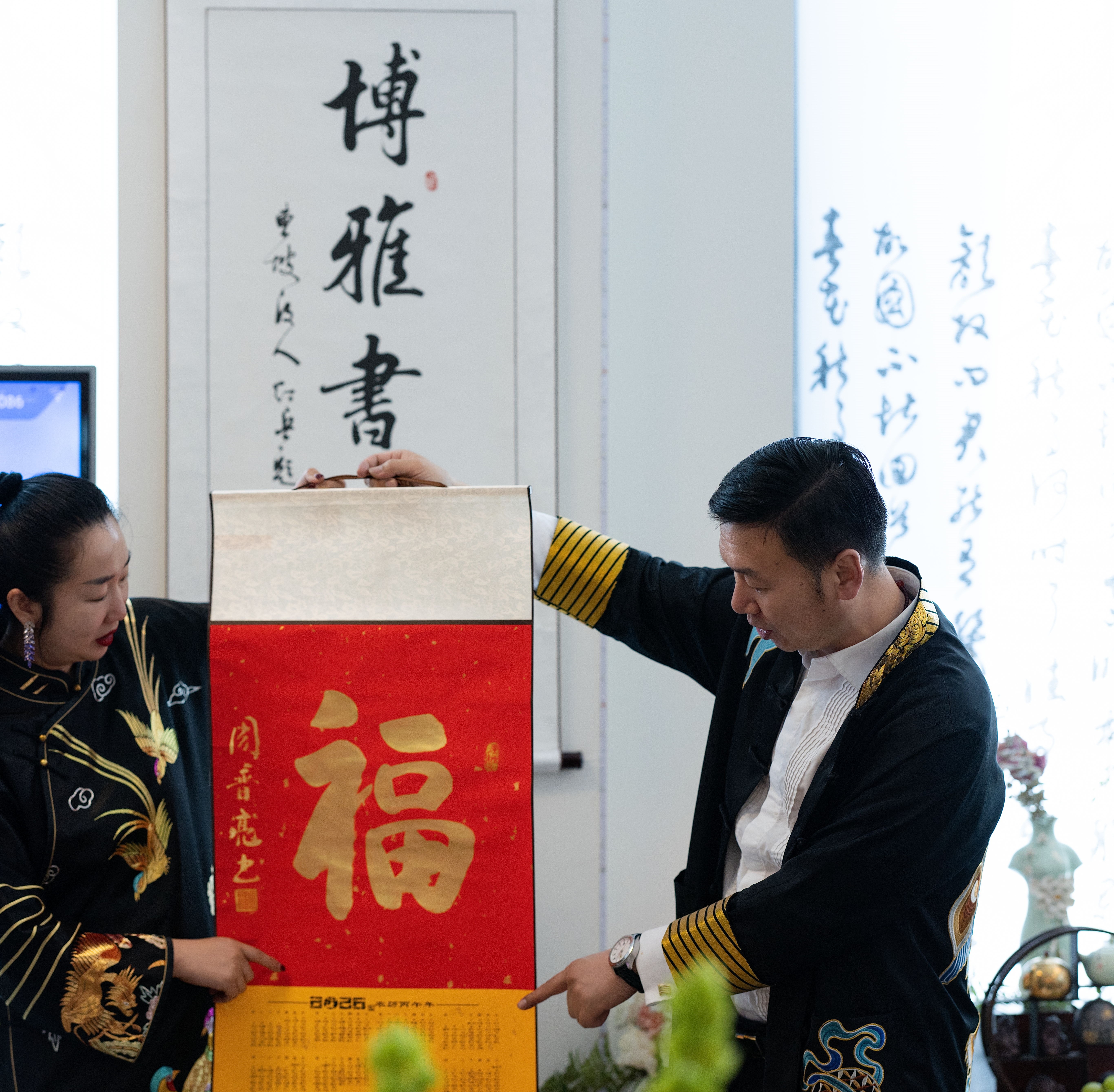 美国北美经济导报社北京分社社长、美国大迈阿密都会区驻京办主任任明睿(Reyoin Ming)先生作为特邀嘉宾出席活动。在交流环节中,他向来宾介绍了美国北美经济导报社的发展情况,并分享了自己长期从事中美文化与商业交流的经历。任明睿先生同时也是一位书法爱好者,当天他特别带来了自己提前书写的“福”字赠予博雅书院,并向书院赠送丝巾等礼物,以表达对中华文化交流的美好祝愿。