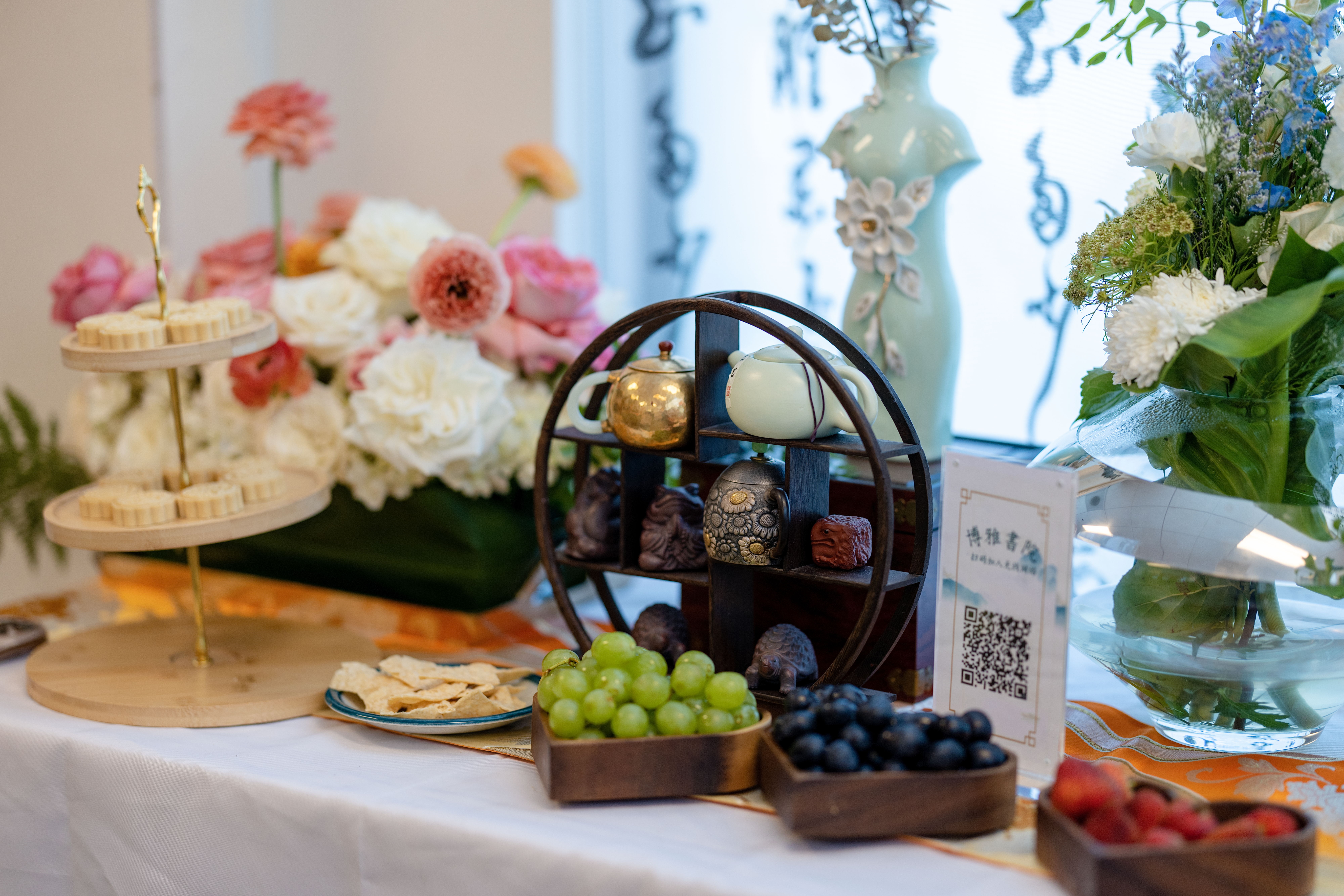 活动现场布置典雅宁静,书法、花艺与东方器物相映成趣,茶点与雅设错落有致,使整场沙龙在温润从容的文化气息中徐徐展开。博雅书院掌门人子淇老师以“新中式生活美学”为切入点,围绕祥瑞麒麟非遗华服的文化理念与设计精神进行分享,从传统服饰礼制、纹样寓意到当代设计表达,为来宾勾勒出一幅跨越时空的东方服饰文化图景。