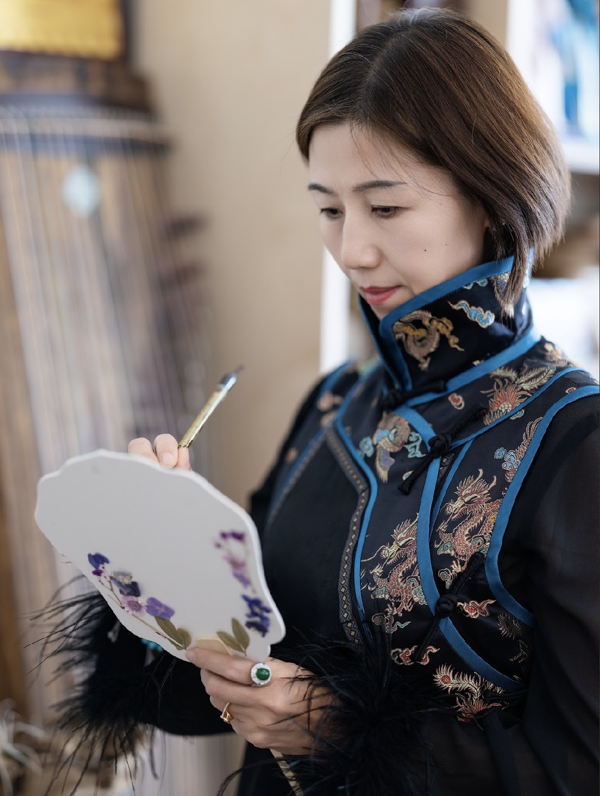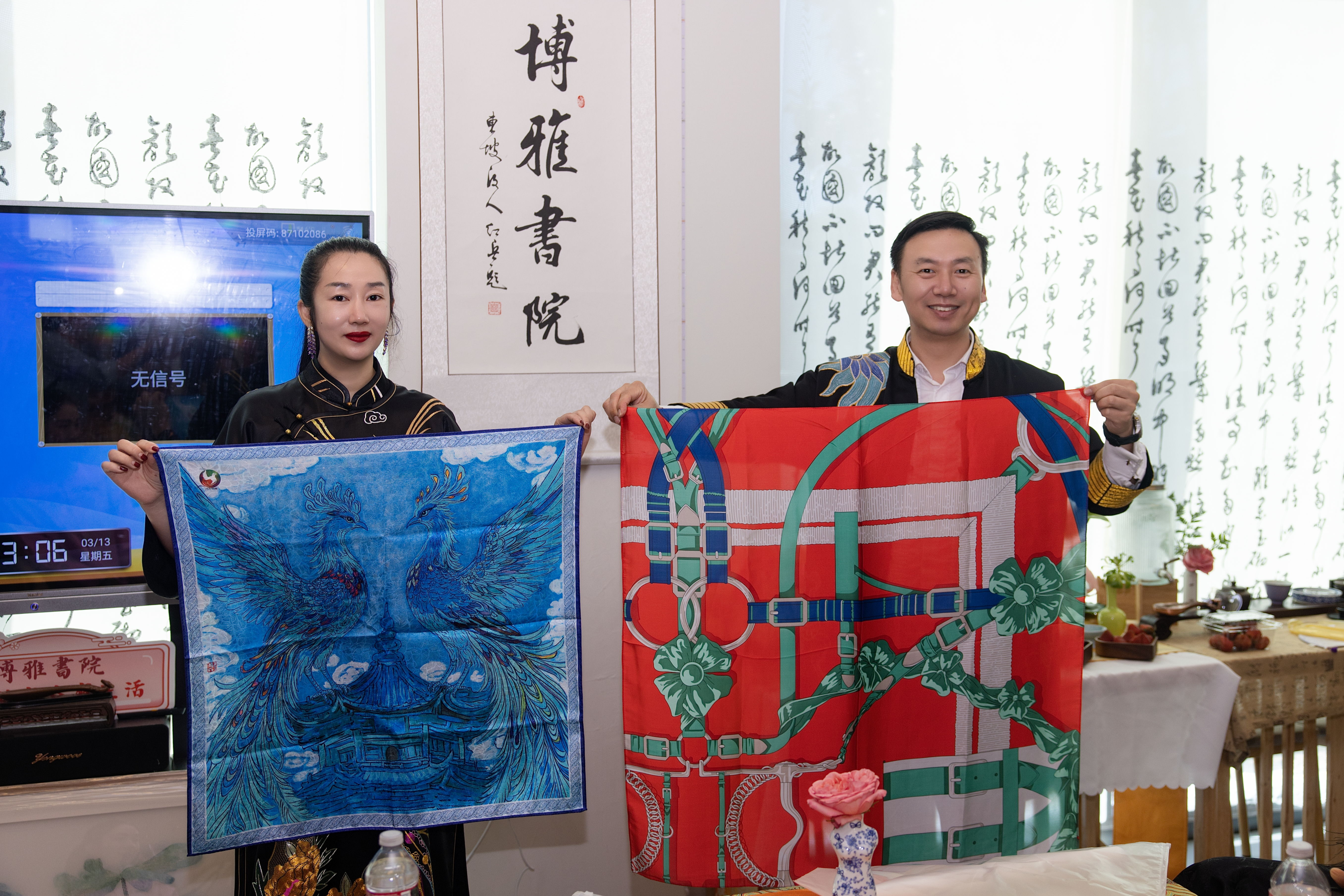 在活动尾声环节,文化创作者每文(“每文在路上”主理人、中华商报特邀撰稿人)向博雅书院赠送了东方传统绢扇。绢扇作为中国传统雅器之一,自古承载着文人风雅与东方审美。轻盈的扇面与祥瑞麒麟非遗华服文化相映成趣,也为书院空间增添了一抹温润而典雅的东方气息。