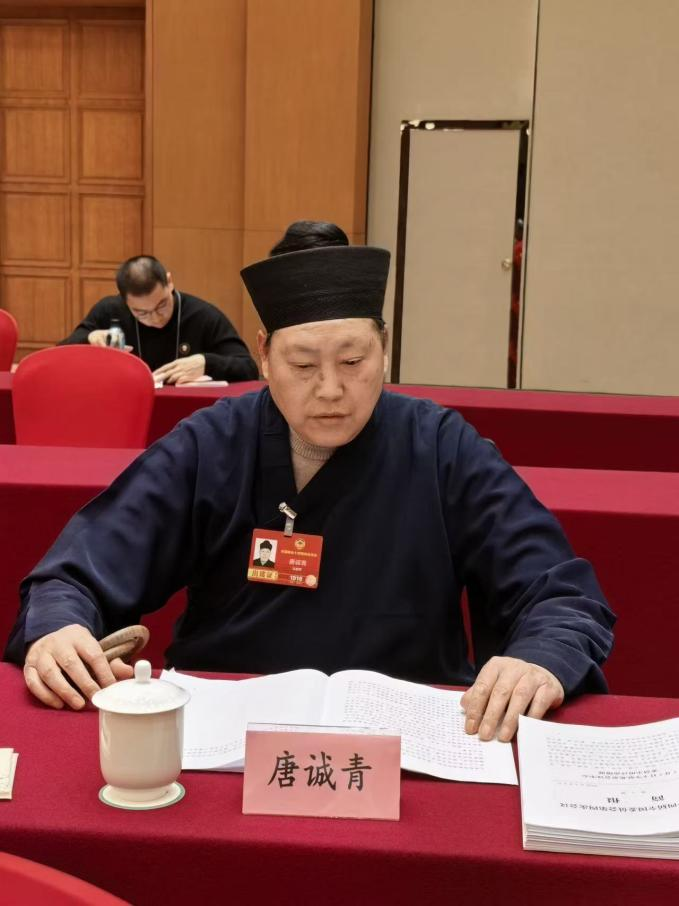 全国政协十四届四次会议期间,身着道袍的唐诚青委员神情庄重,在人民大会堂内留影。他胸前佩戴的红色出席证,不仅是身份的象征,更承载着道门弟子与宗教界人士对国家发展的深切期盼。作为来自四川青城山的宗教界代表,唐诚青长期关注道教文化遗产保护与场所安全问题。